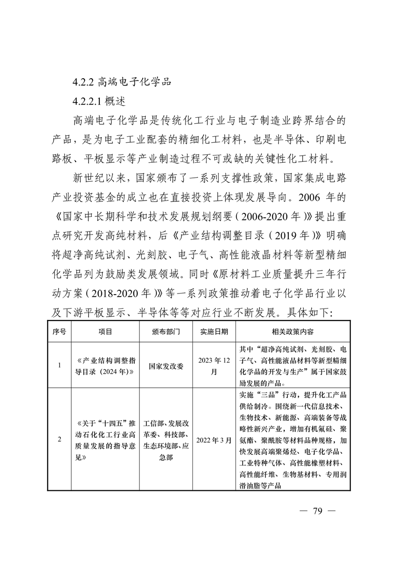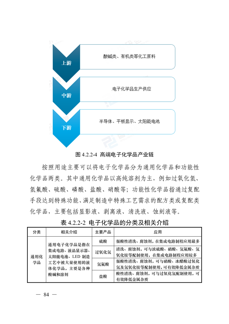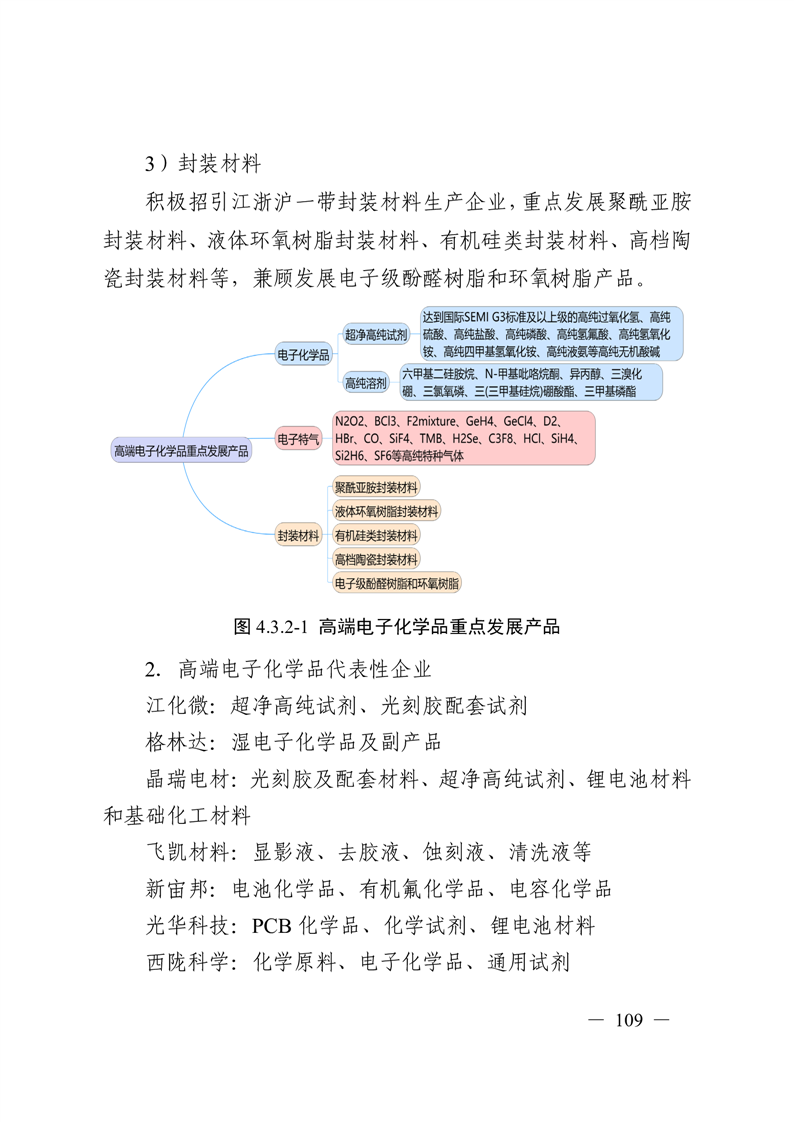 高端电子化学品主要发展:①电子化学品,如超净高纯试剂、高纯溶剂。②电子特气,如高纯氯化氢、一氧化碳、硅烷等。③封装材料,如聚酰亚胺封装材料、液体环氧树脂封装材料、有机硅类封装材料等,兼顾发展电子级酚醛树脂和环氧树脂产品。