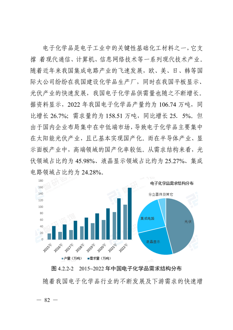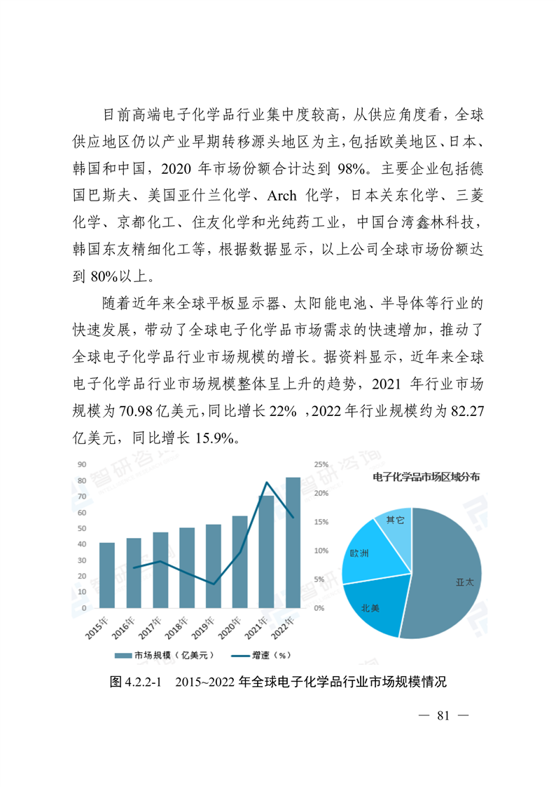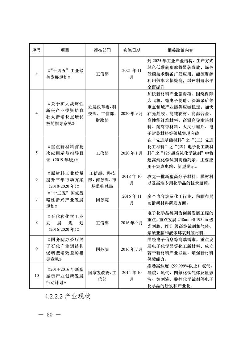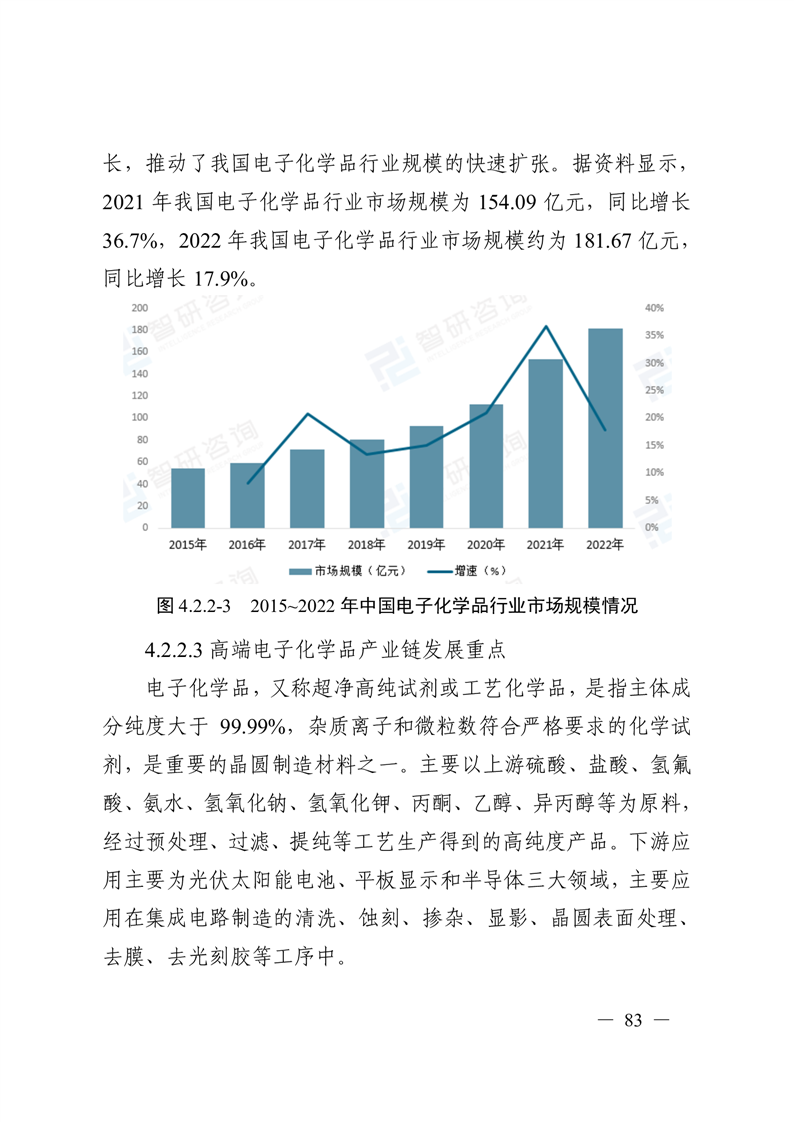高端电子化学品主要发展:①电子化学品,如超净高纯试剂、高纯溶剂。②电子特气,如高纯氯化氢、一氧化碳、硅烷等。③封装材料,如聚酰亚胺封装材料、液体环氧树脂封装材料、有机硅类封装材料等,兼顾发展电子级酚醛树脂和环氧树脂产品。