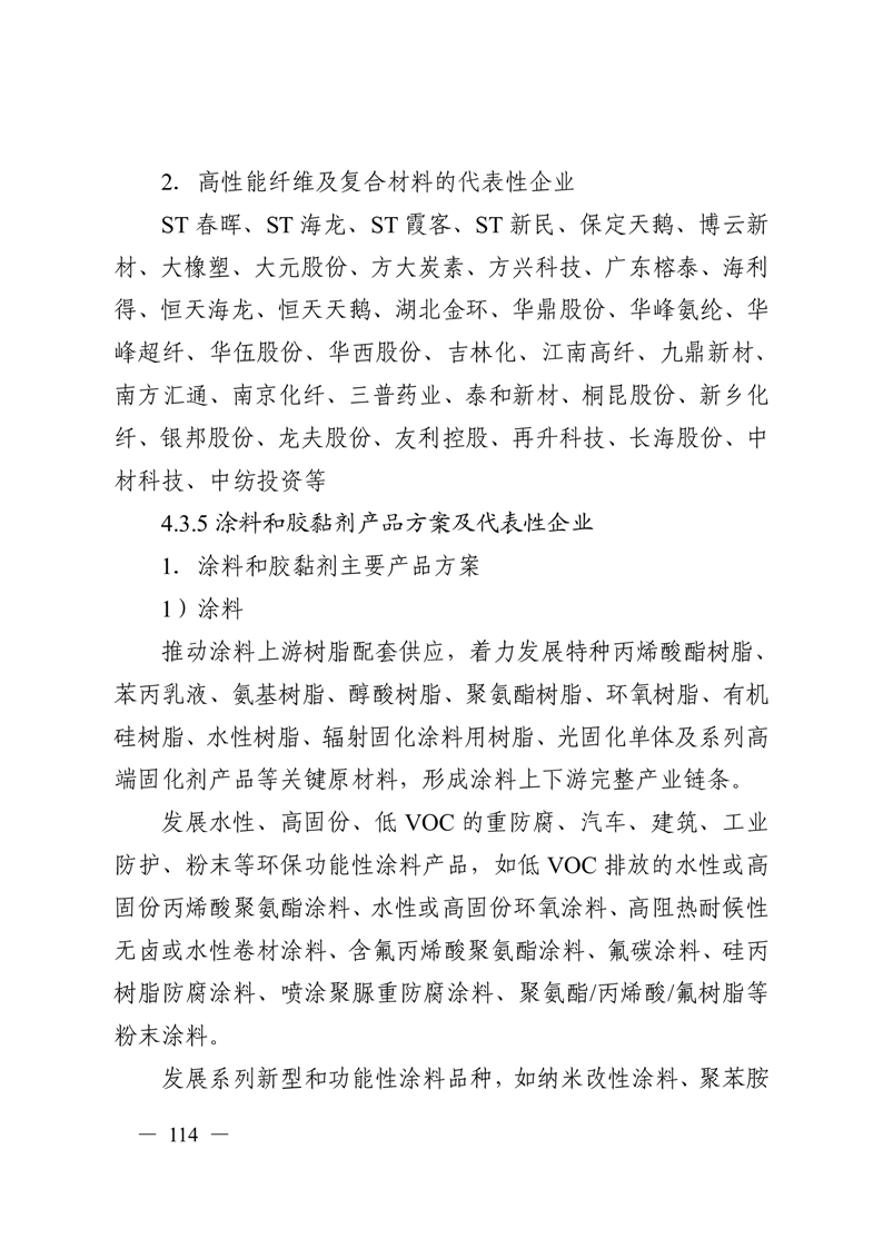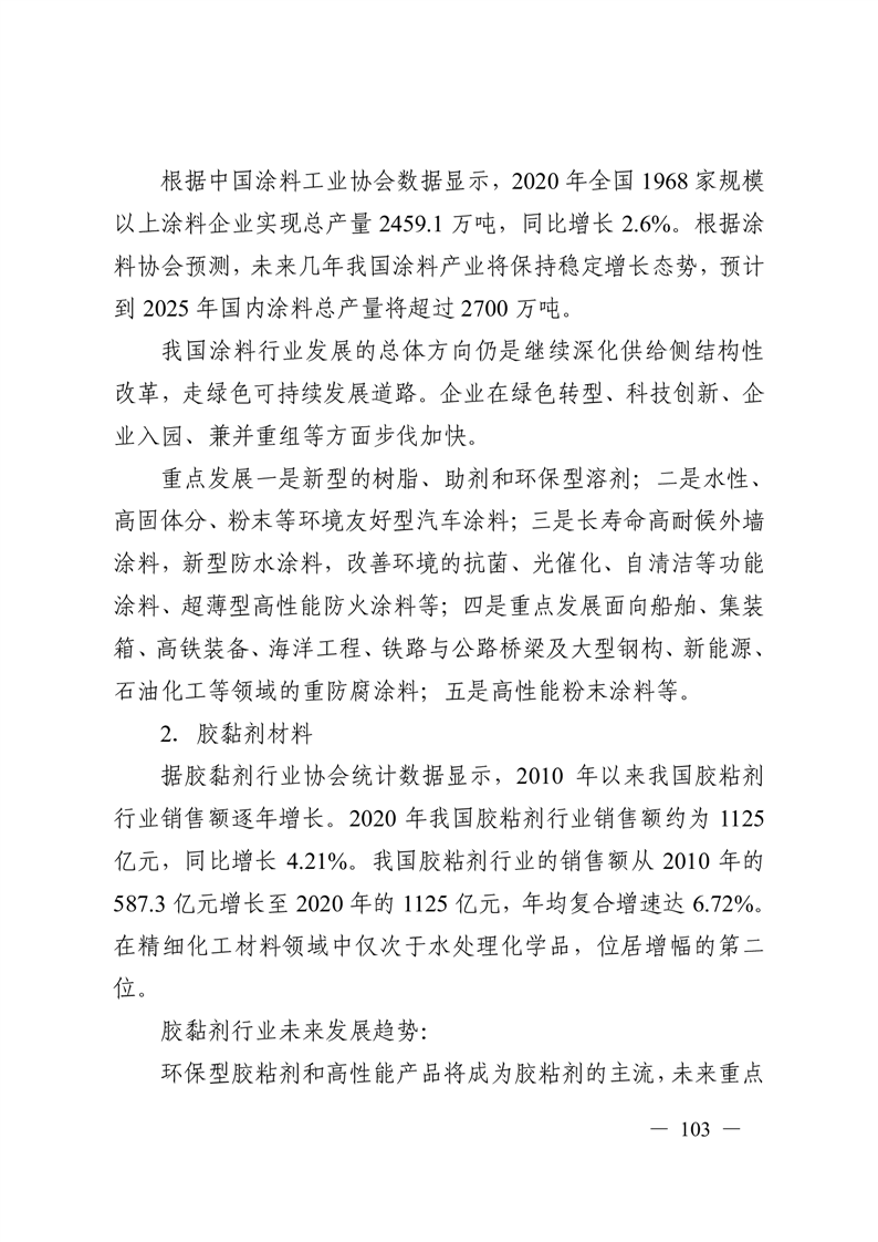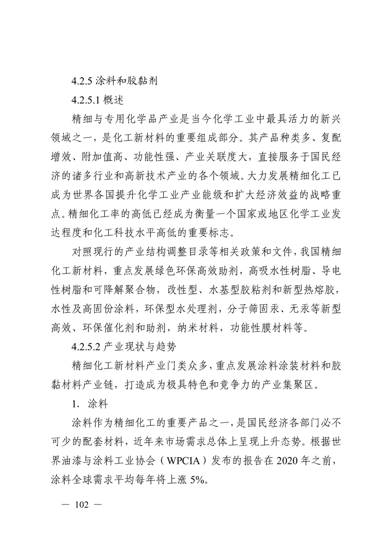 涂料和胶黏剂主要发展:①涂料:发展水性、高固份、低VOC 的重防腐、汽车、建筑、工业防护、粉末等环保功能性涂料产品。②胶黏剂:重点发展包括水性丙烯酸;无污染、固化迅速的热熔胶、热熔压敏胶、导电胶;包装材料用有机硅胶、改性丙烯酸酯胶、厌氧胶等胶黏剂产品。