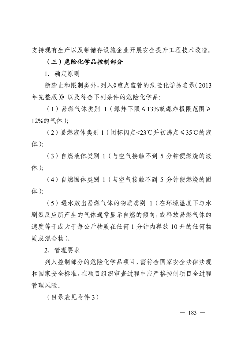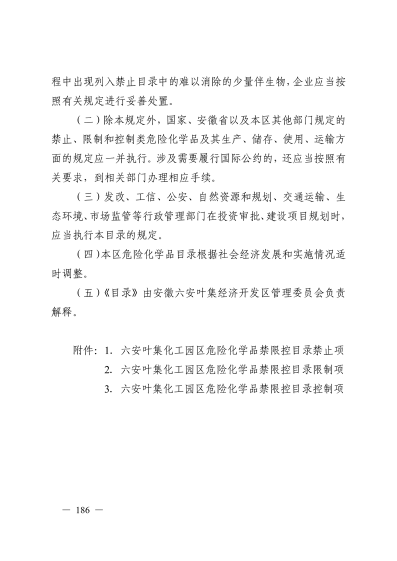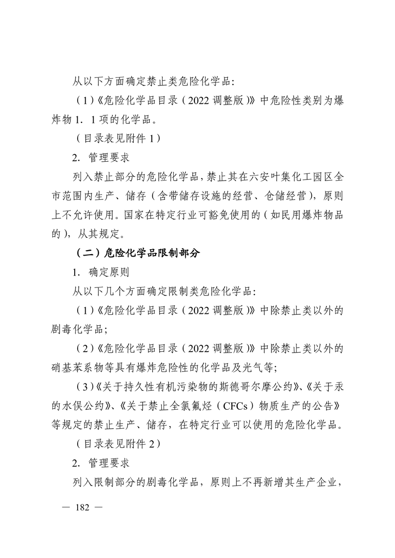 根据《化工园区安全风险排查治理导则》《关于进一步规范化工项目建设管理的通知》(皖经信原材料函〔2022〕73 号)等规定,在上级现行规范的基础上,结合园区实际,经济开发区管委委托安徽英特力工业工程技术有限公司一并编制了叶集化工园区《危险化学品禁限控目录》和《项目安全准入条件》,作为《规划》的补充。通过对特定品种的危险化学品和有关工艺实施禁止、限制和控制等精细、有效的管理,从源头上管控、降低城市安全风险,严禁“两低三高”(附加值低、技术水平低、能耗高、污染物排放高、安全生产风险高)项目落户,强化园区主导产业和产业链建设,做大做强产业集群,推动园区高质量发展。