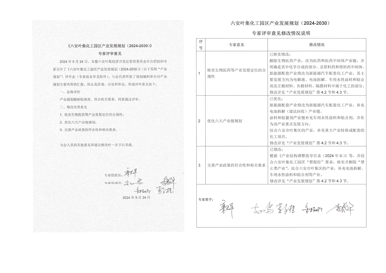 2024年5月24日,安徽六安叶集经济开发区管理委员会在合肥组织专家召开了《六安叶集化工园区产业发展规划(2024-2030)》评审会,会上共收到专家意见3条。