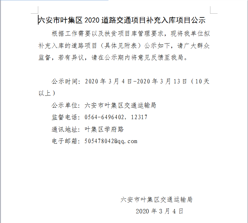 六安市叶集区交通运输局关于2020道路交通项目补充入库项目公示