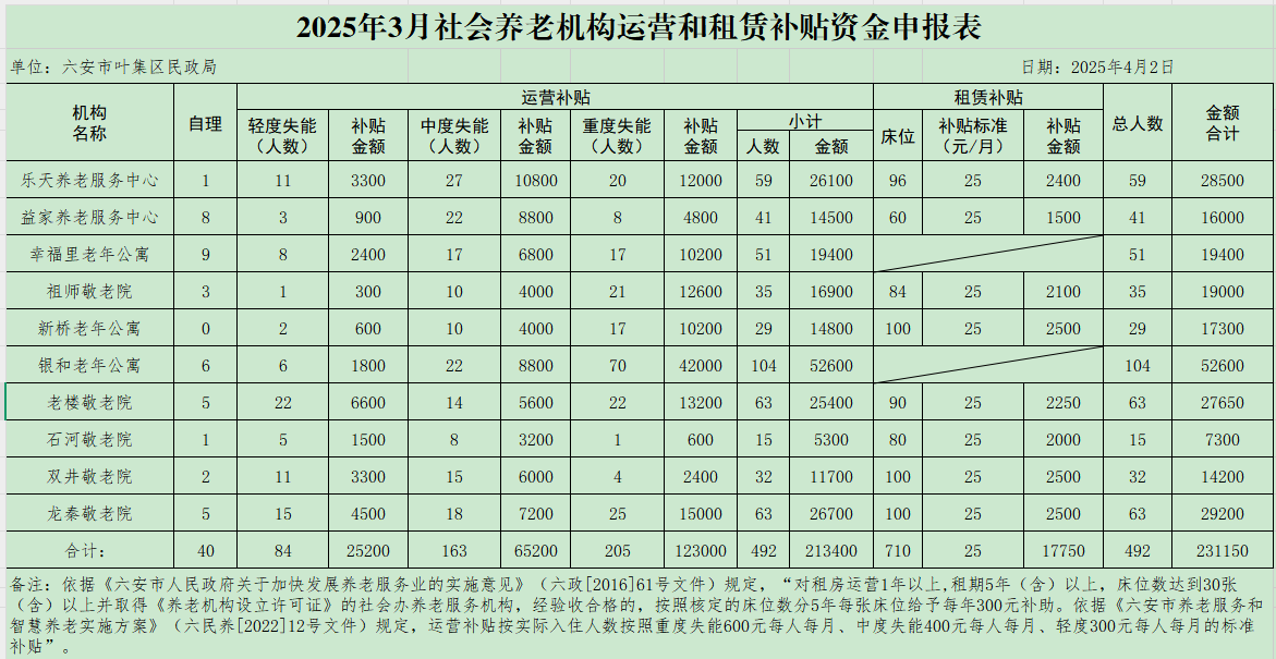 2025年3月社会养老机构运营和租赁补贴资金申报情况