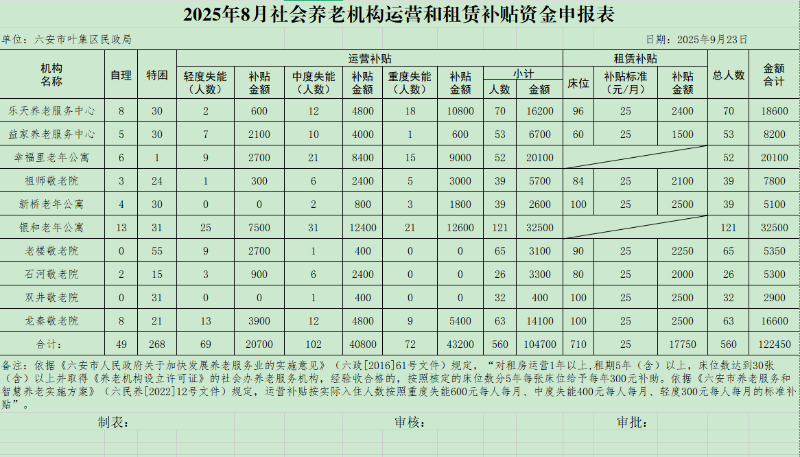 2025年8月社会养老机构运营和租赁补贴资金申报情况