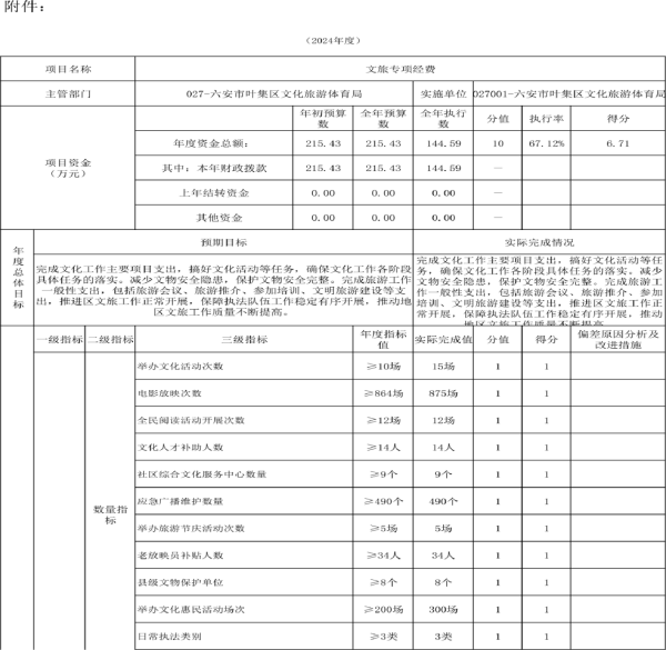 六安市叶集区文化旅游体育局在2024年度部门决算中反映“文旅专项经费”项目绩效自评综述和所有项目支出绩效自评表。
