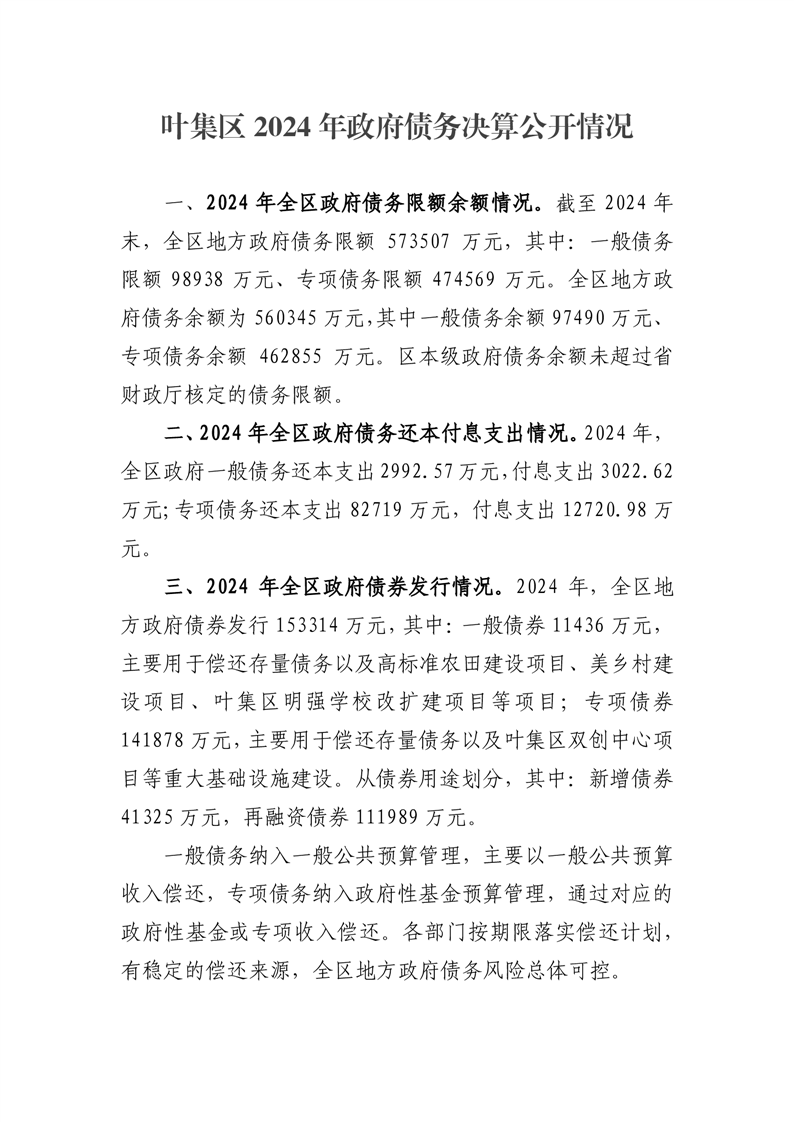 叶集区2024年政府债务决算公开情况