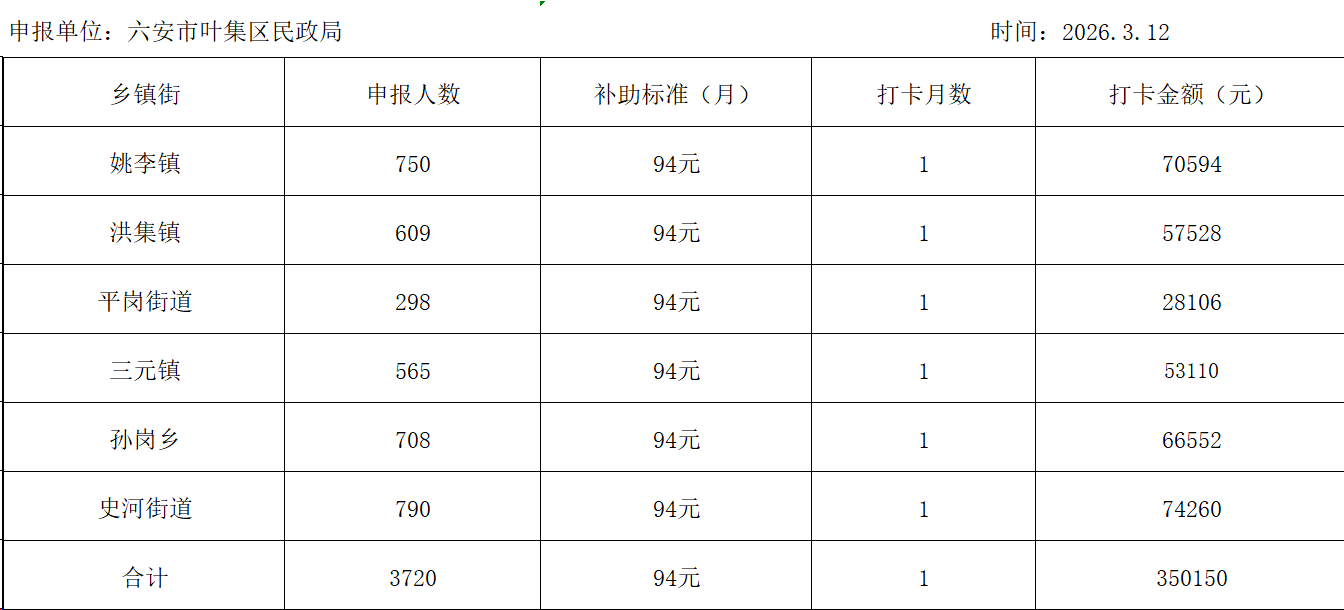 叶集区2026年度3月重度残疾人护理补贴资金申报表