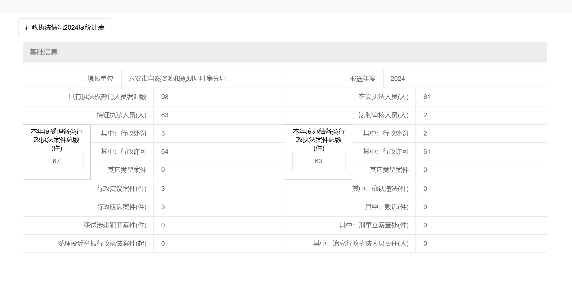 六安市自然资源和规划局叶集分局2024年行政执法统计年报