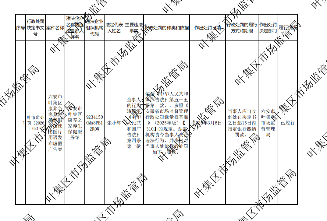 六安市叶集区市场监督管理局行政处罚案件信息公开表叶市监处罚〔2026〕021号