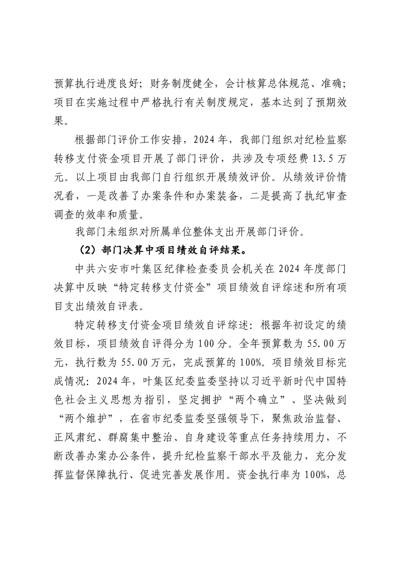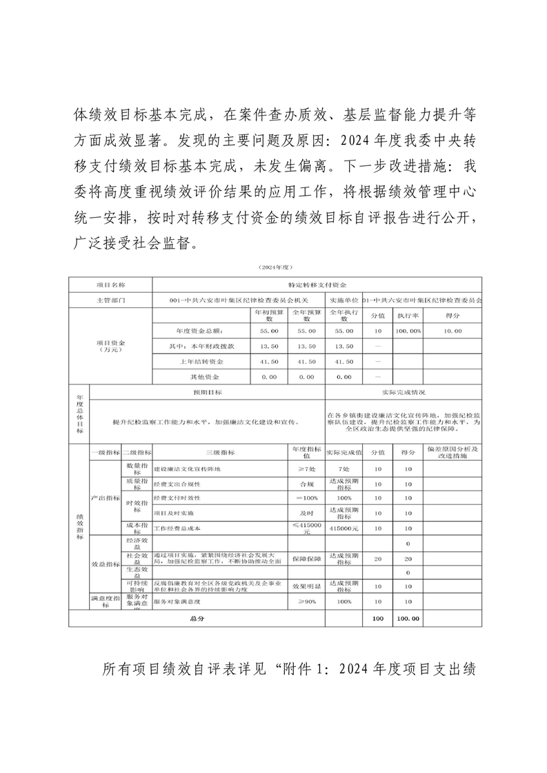 附件2:叶集区中央纪检监察转移支付2024年度绩效自评报告.doc
