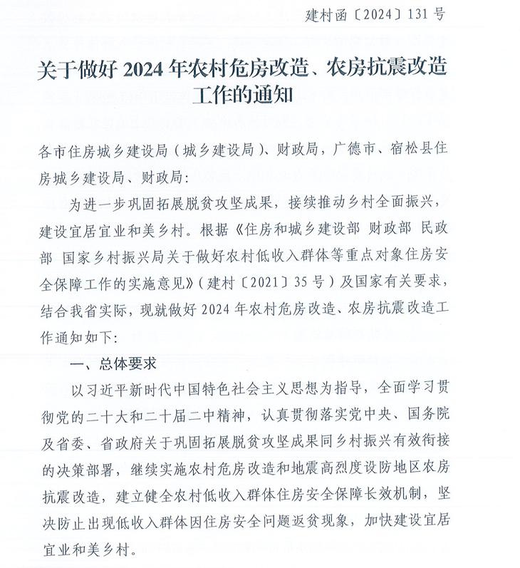 【政策文件】安徽省住房和城乡建设厅关于做好2024年农村危房改造、农房抗震改造工作的通知(有效)