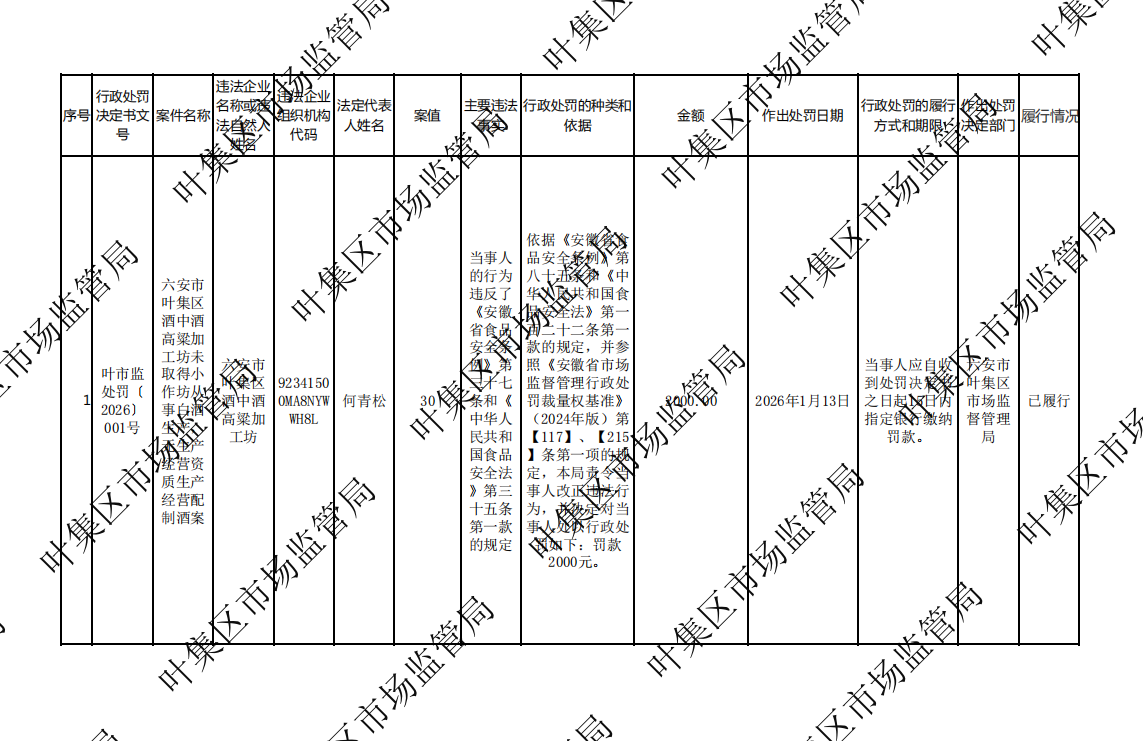 六安市叶集区市场监督管理局行政处罚案件信息公开表叶市监处罚〔2026〕001号
