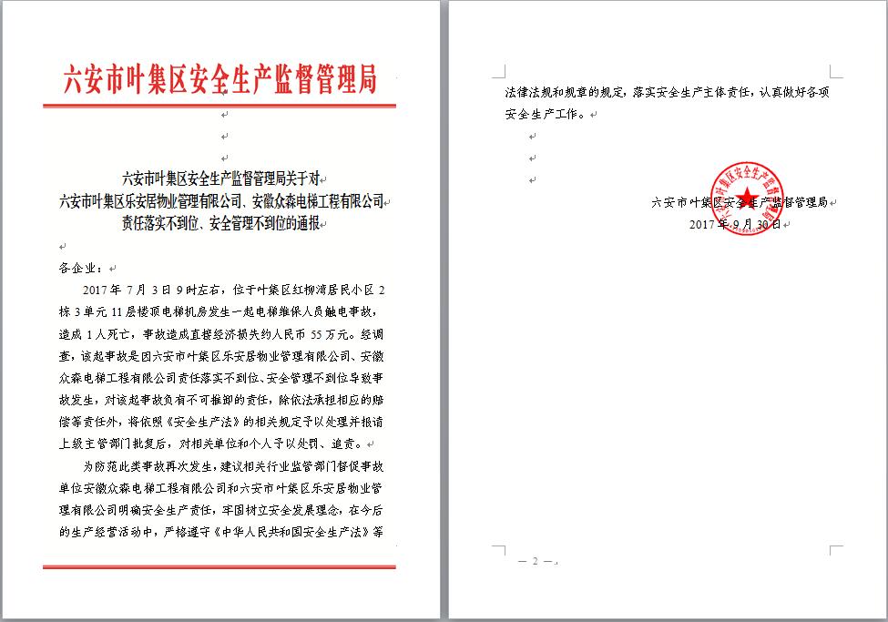 | 名 称: | 六安市叶集区乐安居物业管理有限公司、安徽众森电梯工程有限公司责任落实不到位、安全管理不到位的通报 |