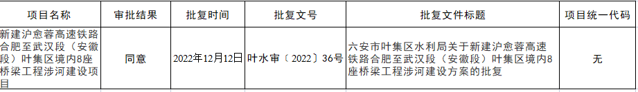 | 名 称: | 六安市叶集区水利局关于新建沪愈蓉高速铁路合肥至武汉段(安徽段)叶集区境内8座桥梁工程涉河建设方案的批复 | ||