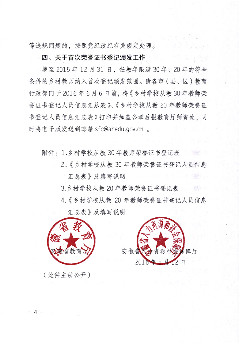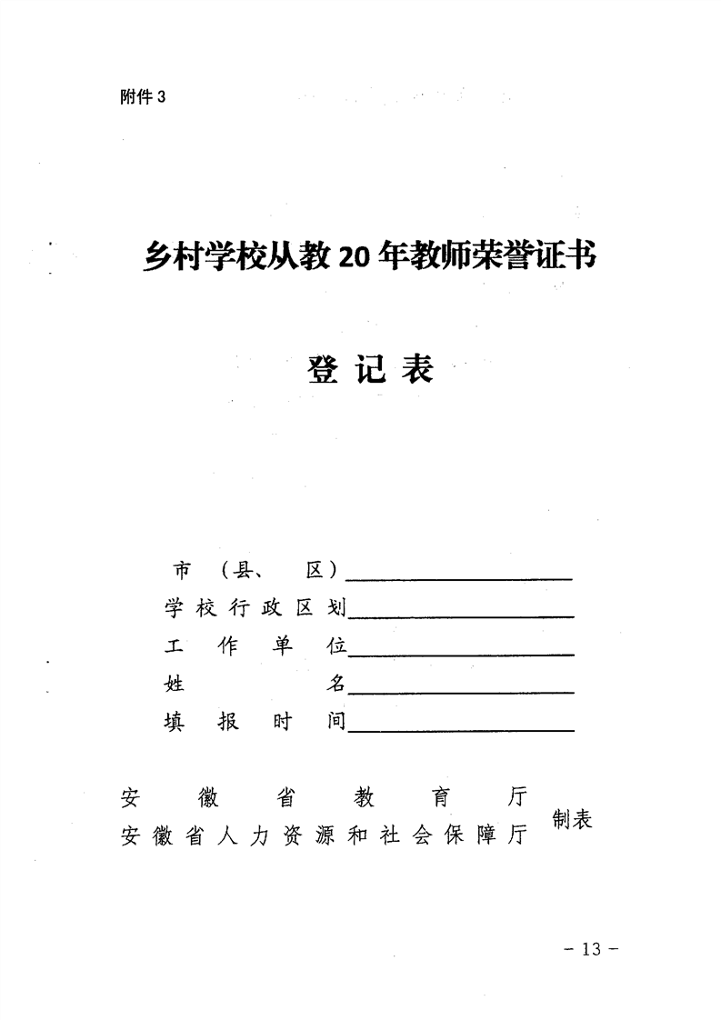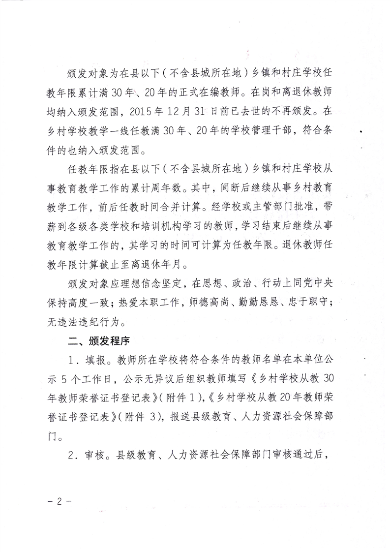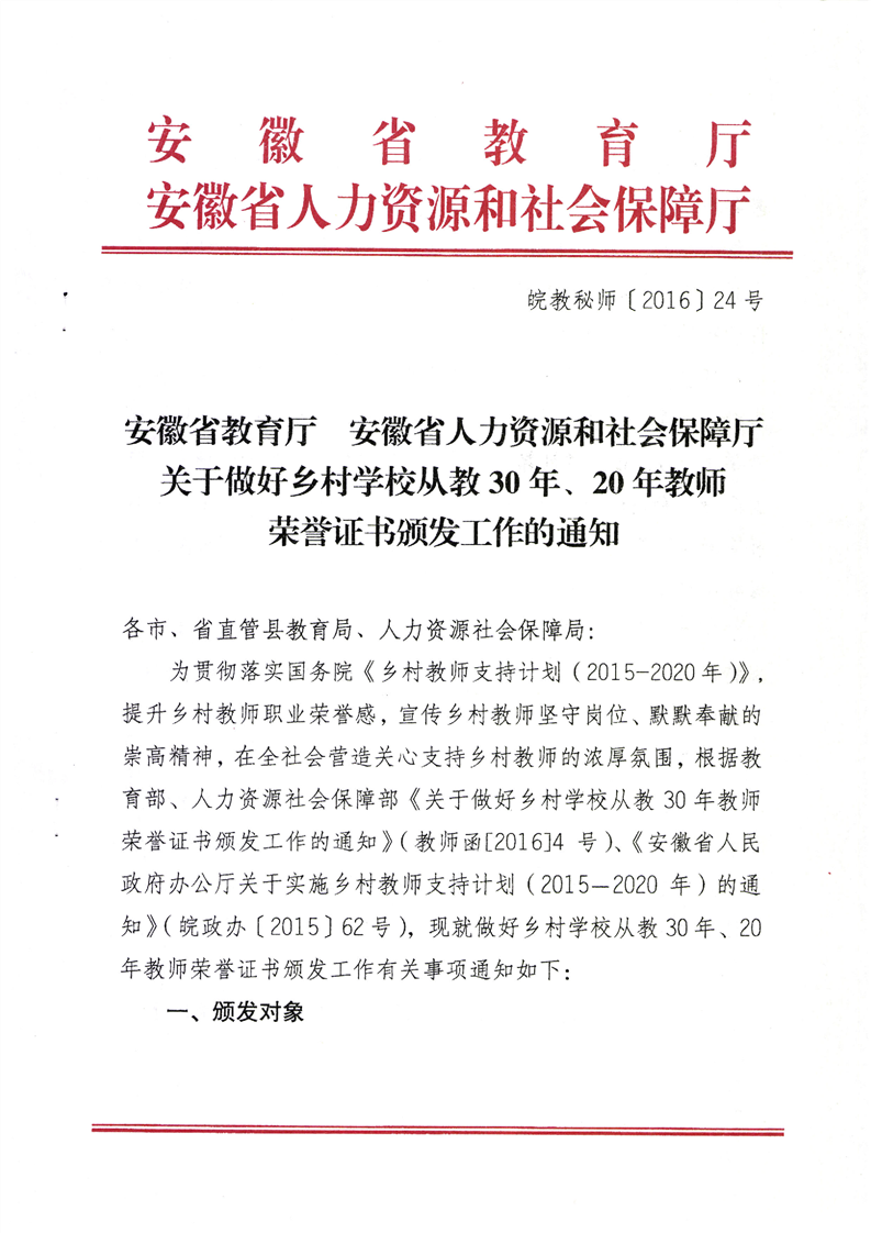 自安徽省教育厅、人力资源和社会保障厅2016年联合发布《关于做好乡村教师30年、20年教师荣誉证书颁发工作的通知》(皖教秘师〔2016〕24号)以来,暂未出台关于任教30年乡村教师以上教师申请荣誉证书的其他相关政策,现将此文附下: