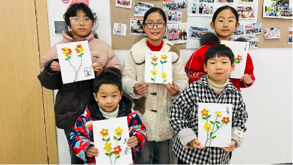 活动伊始,志愿者讲述了“立春”节气的起源、习俗等小知识,进行了趣味互动,让孩子们更好地了解二十四节气。衍纸又称卷纸,是纸艺大家族中比较独特的一项,是一门十分古老的传统工艺。孩子们通过卷、粘、捏等手法,拼接出了色彩缤纷、形状各异的属于自己的独特衍纸迎春图。也将自己对新一年的美好希望藏进了衍纸画里。