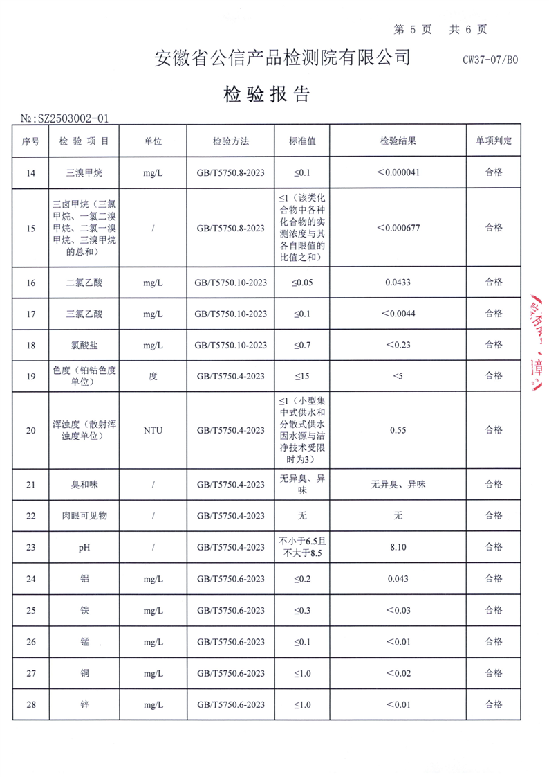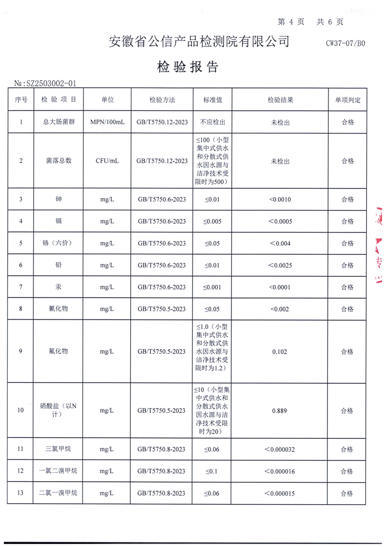 | 名 称: | 六安市叶集区2025年3月城乡供水一体化(梅山水厂管网延伸)洪集片区水质检测报告 | ||