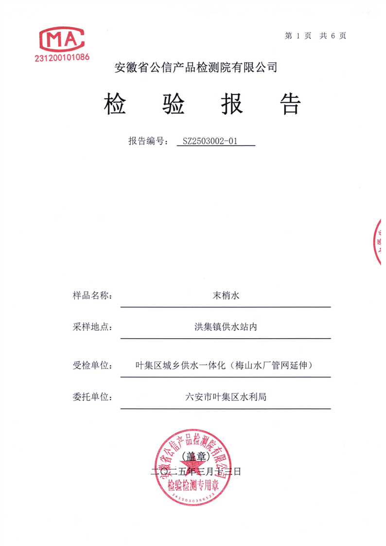 | 名 称: | 六安市叶集区2025年3月城乡供水一体化(梅山水厂管网延伸)洪集片区水质检测报告 |
