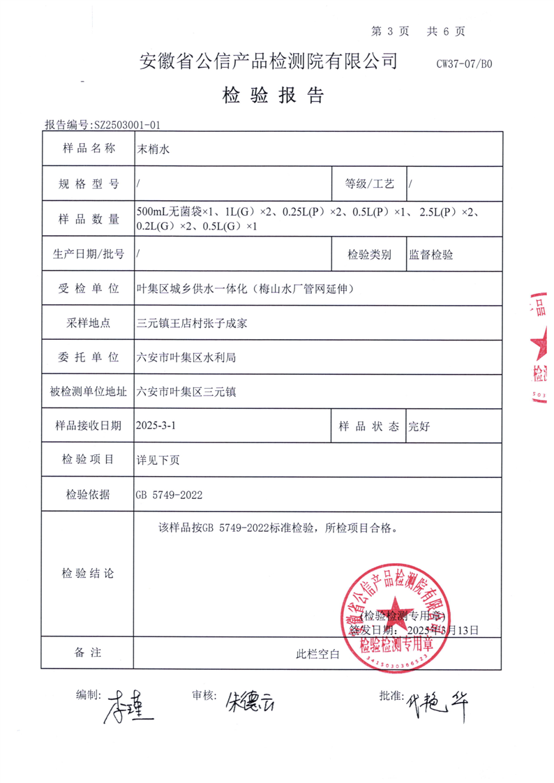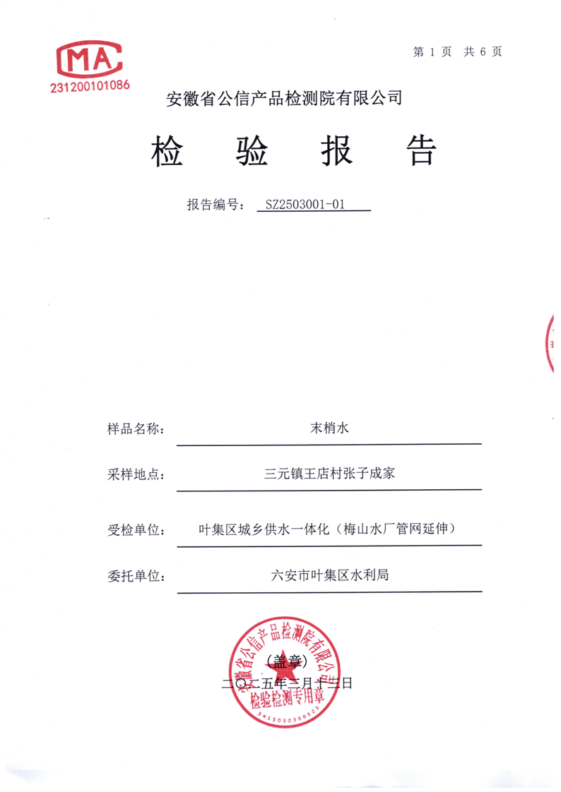 | 名 称: | 六安市叶集区2025年3月份城乡供水一体化(梅山水厂管网延伸)水质检测报告 |