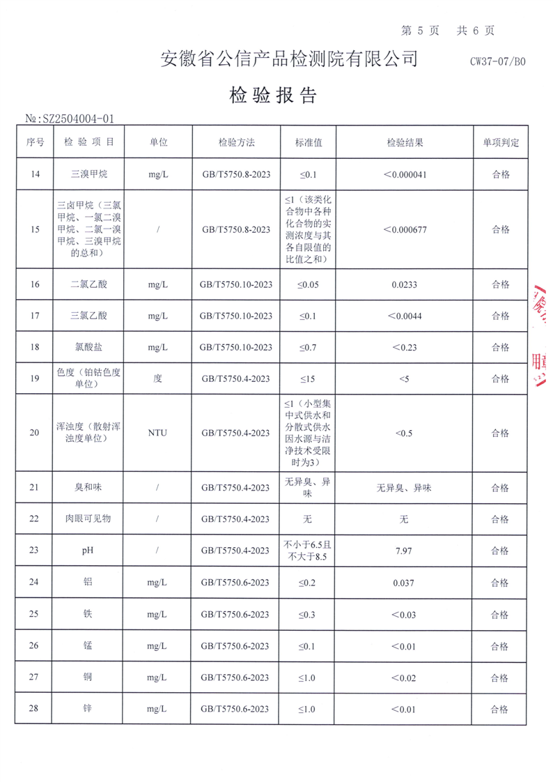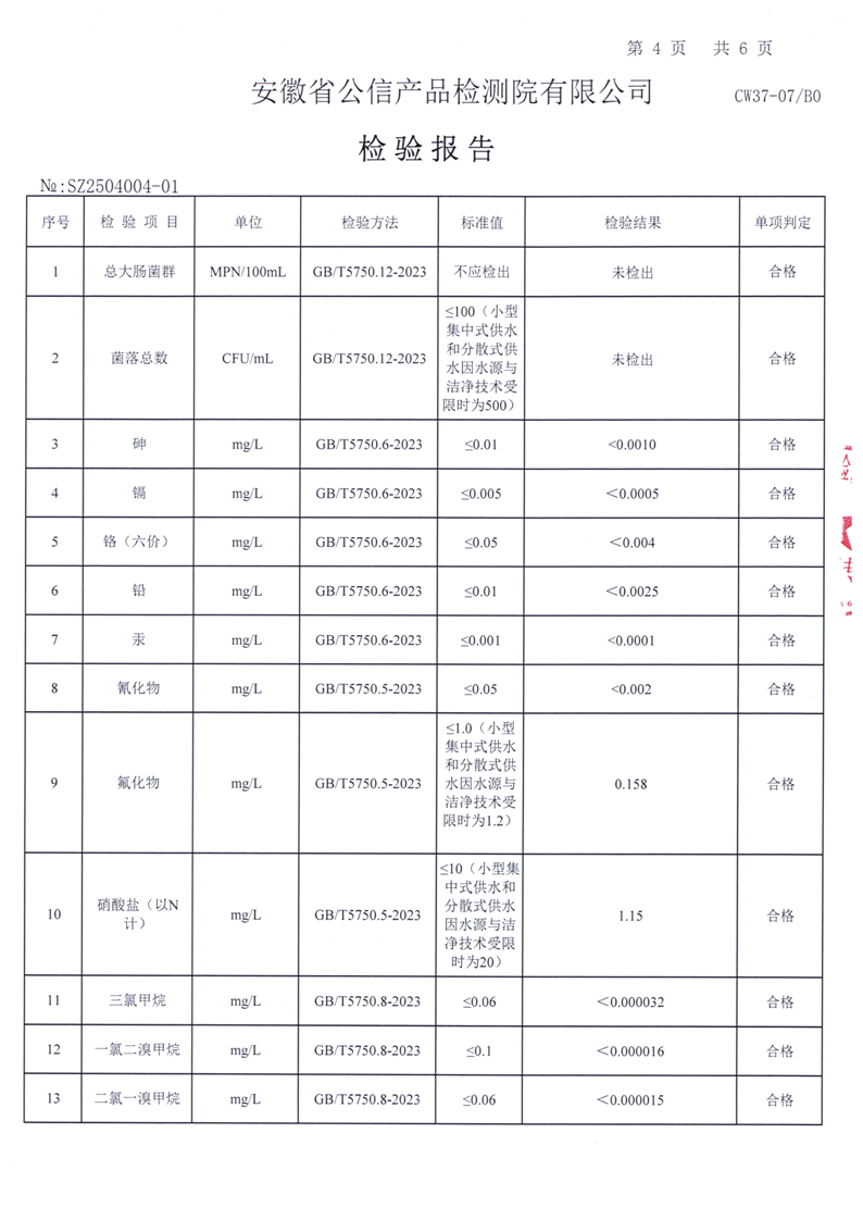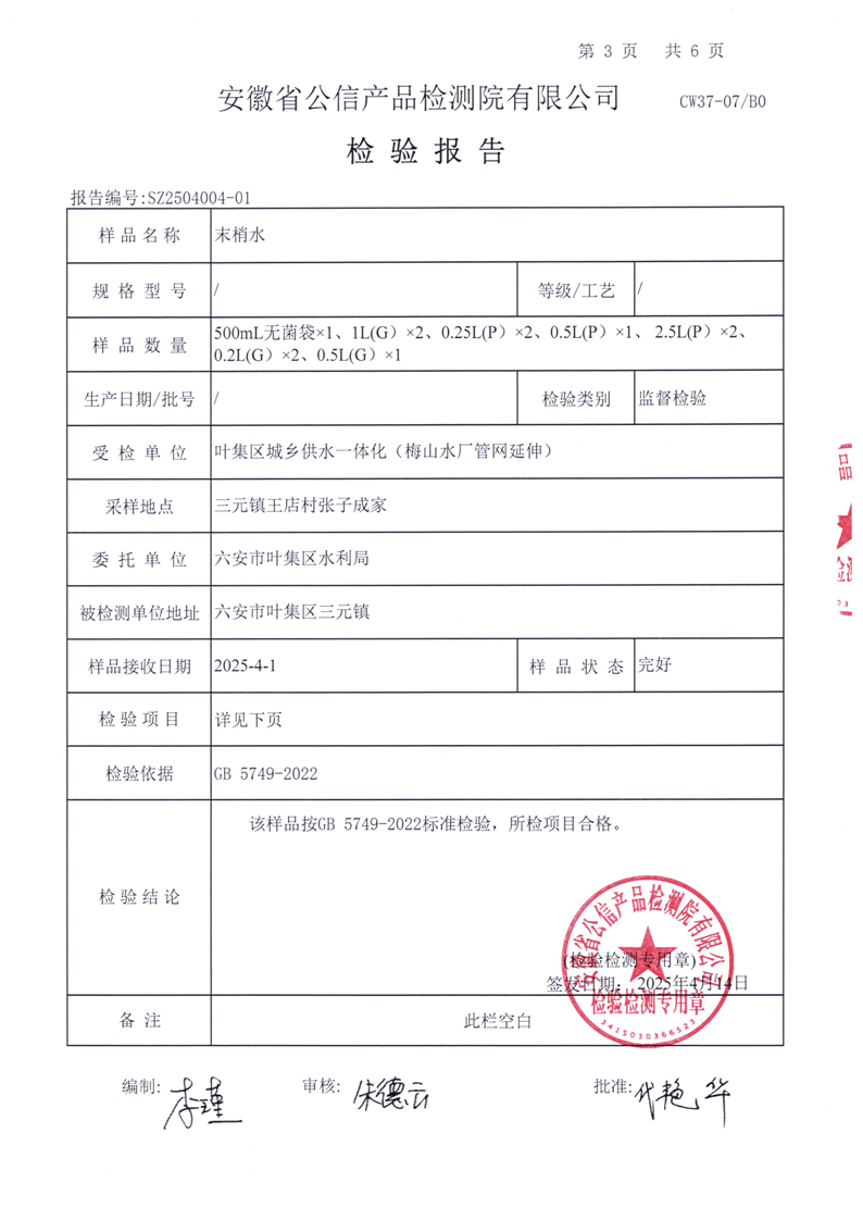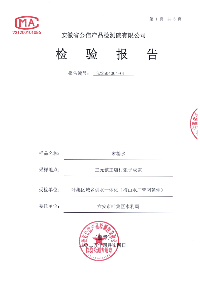 | 名 称: | 六安市叶集区2025年4月份城乡供水一体化(梅山水厂管网延伸)水质检测报告 | ||