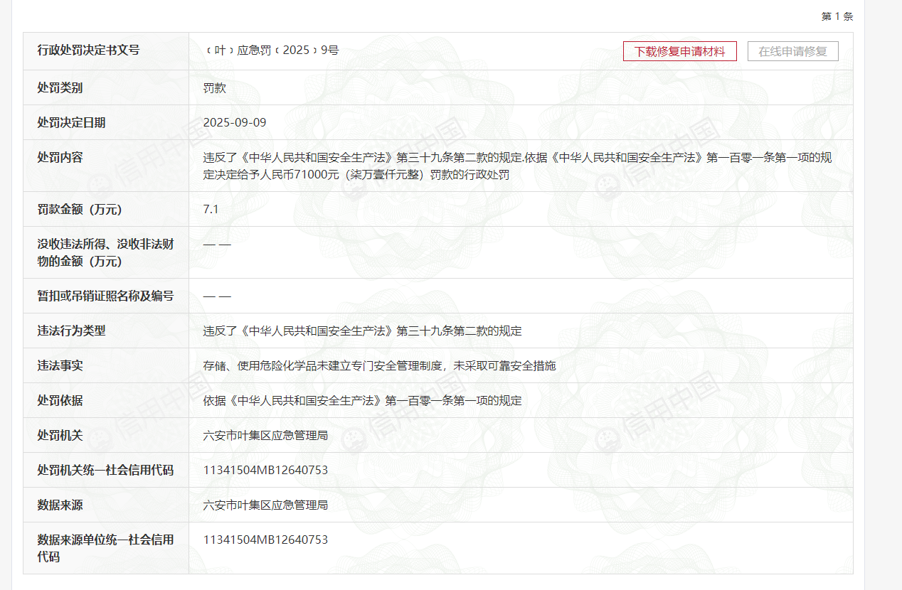 | 名 称: | 叶集区应急管理局2025年安全生产行政处罚案件(九) |