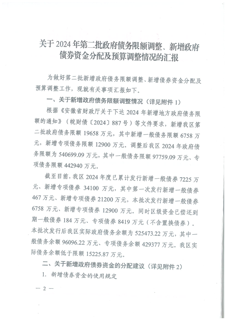 关于2024年第二批政府债务限额调整、新增政府债券资金分配及预算调整情况的报告
