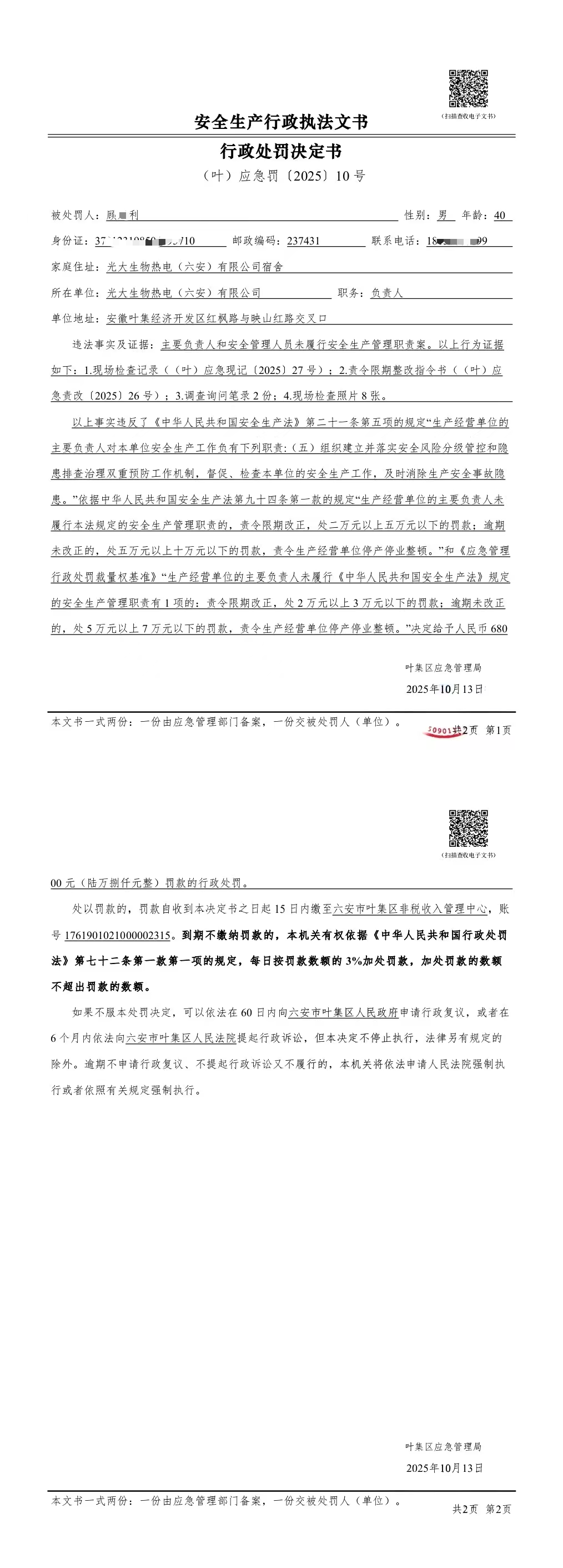 | 名 称: | 叶集区应急管理局2025年安全生产行政处罚案件(十) |