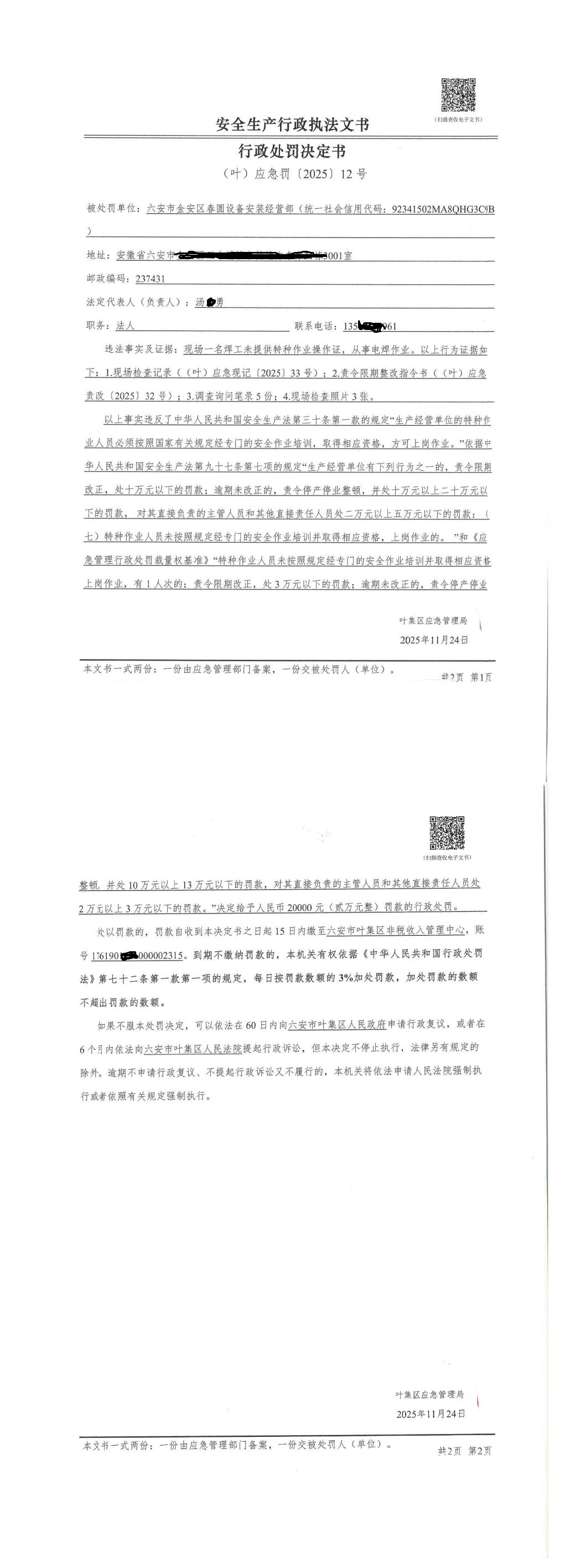 | 名 称: | 叶集区应急管理局2025年安全生产行政处罚案件(十二) |
