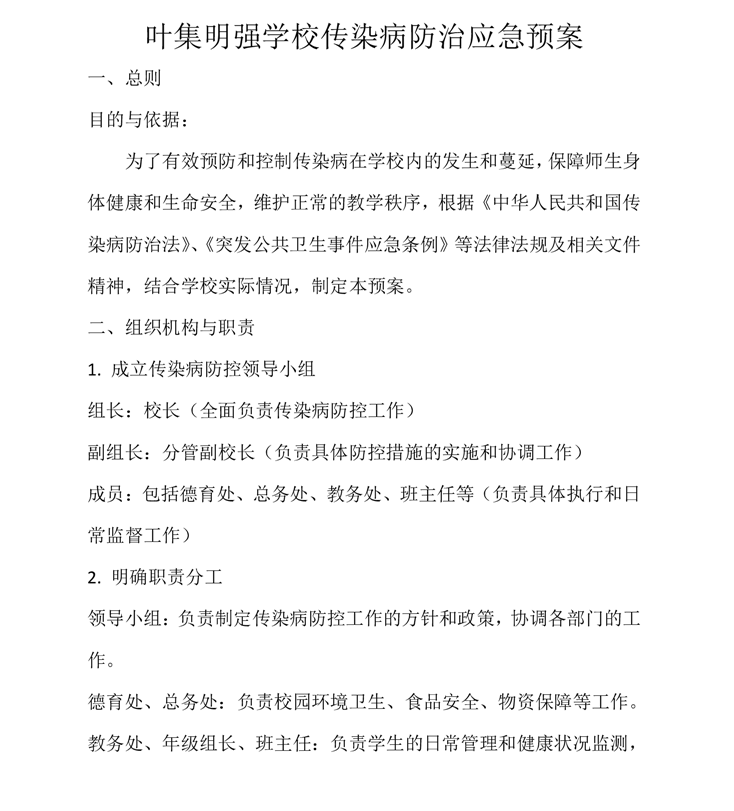 叶集明强学校传染病防治应急预案 |