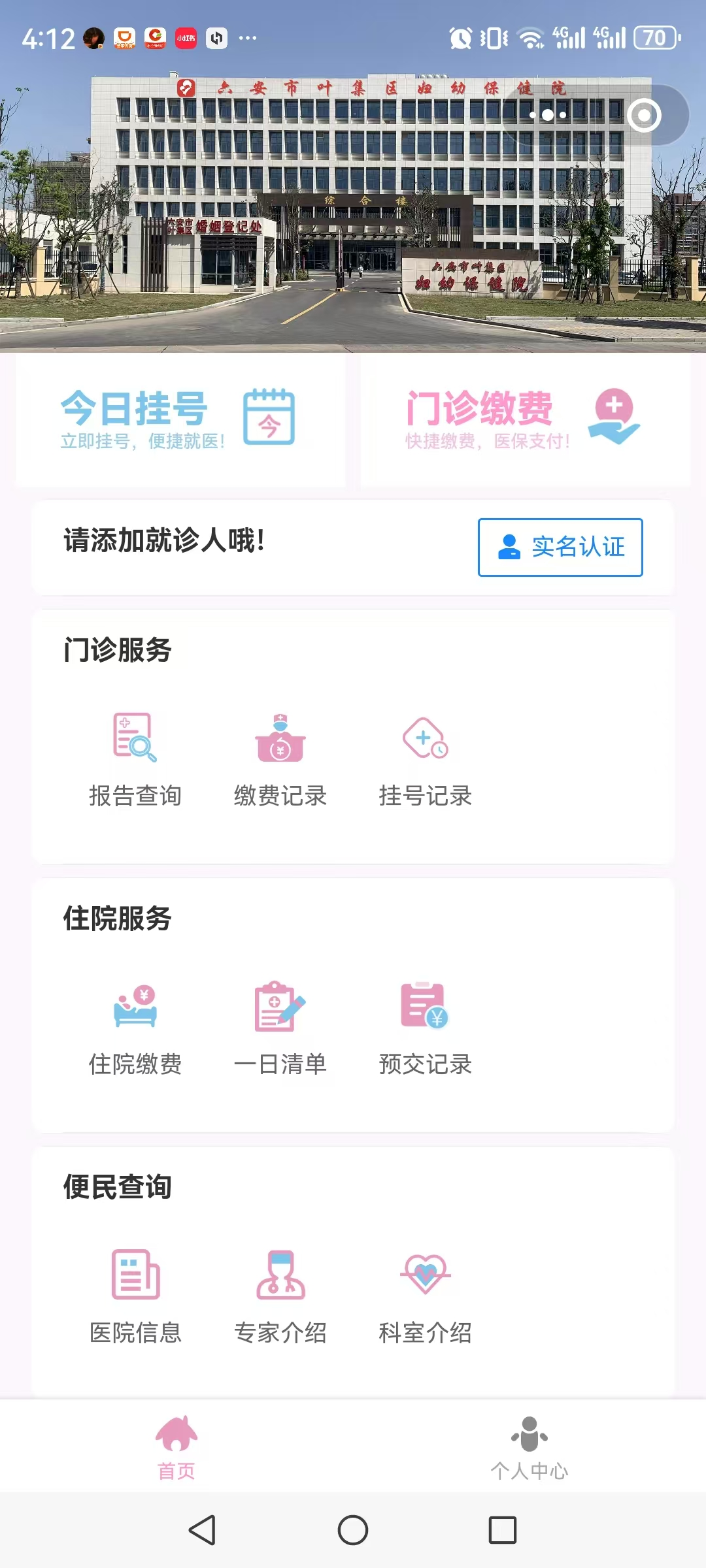 流程:手机微信搜索【叶集区妇幼保健院】并关注服务号→添加就诊人信息→ 选择门诊服务缴费记录模块或住院服务预交记录模块点击进入→查询费用相关信息。