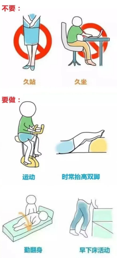 1、多运动:久坐人群每 30 - 60 分钟起身走动 2 - 3 分钟或做“踝泵运动”;术后患者遵医嘱尽早活动,卧床时可翻身、抬腿;长途出行穿宽松衣物,每隔 1 - 2 小时活动关节、多喝水。