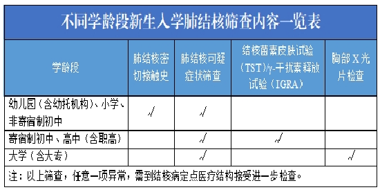 1.幼儿园、小学及非寄宿制初中新生:开展肺结核密切接触史和肺结核可疑症状问诊;有肺结核密切接触史或可疑症状的学生必须完成结核分枝杆菌感染检测。