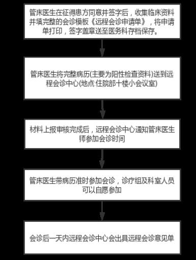管床医生在征得患方同意并签字后,收集临床资料并填写完整的会诊模板《远程会诊申请单》,将申请单打印,签字盖章送至医务科存档保存。管床医生将完整病历(主要为阳性检查资料)送到远程会诊中心(地点:住院部十楼小会议室)。材料上报审核完成后,远程会诊中心通知管床医生参加会诊时间。管床医生带病历准时参加会诊,诊疗组及科室人员可以自愿参加。会诊后一天内远程会诊中心会出具远程会诊意见单。