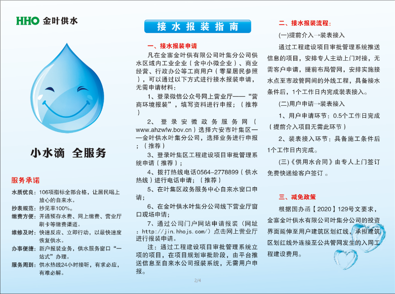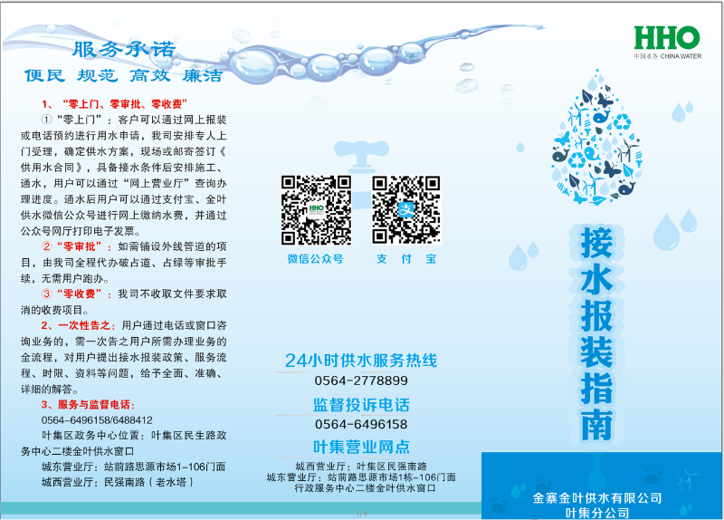 二、供水维修服务:按照“水表出户、一户一表、抄表到户、收费到户”的原则,一户一表改造完成后,明确以用户水表为界,用户水表外的所有供水设施均由金叶供水叶集分公司统一维护管理。用户水表内(含水表)的供水设施由用户自行维护,水表维修须提前联系工作人员,确认用水量,严禁私自更换水表。