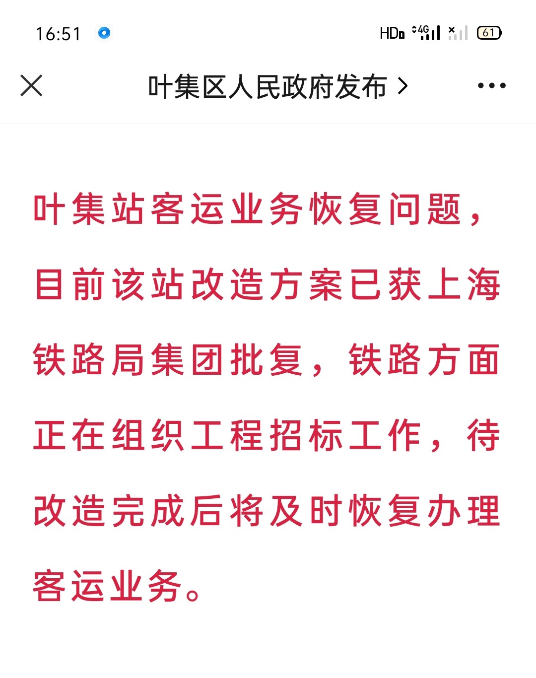 尊敬的市民,您好!您反映的问题已收悉,现将有关情况回复如下:为争取叶集火车站恢复客运业务,我区始终在与省市铁路办、上海铁路总公司及合肥车务段保持高频次衔接,现已完成叶集站恢复办客改造可研方案的现场勘验、编制和审查工作,各项工作正在有序推进,也正在以最大努力争取尽快恢复客运业务。感谢您对我们工作的关注与支持,如有疑问,请联系叶集区发改委,联系电话2770490。
