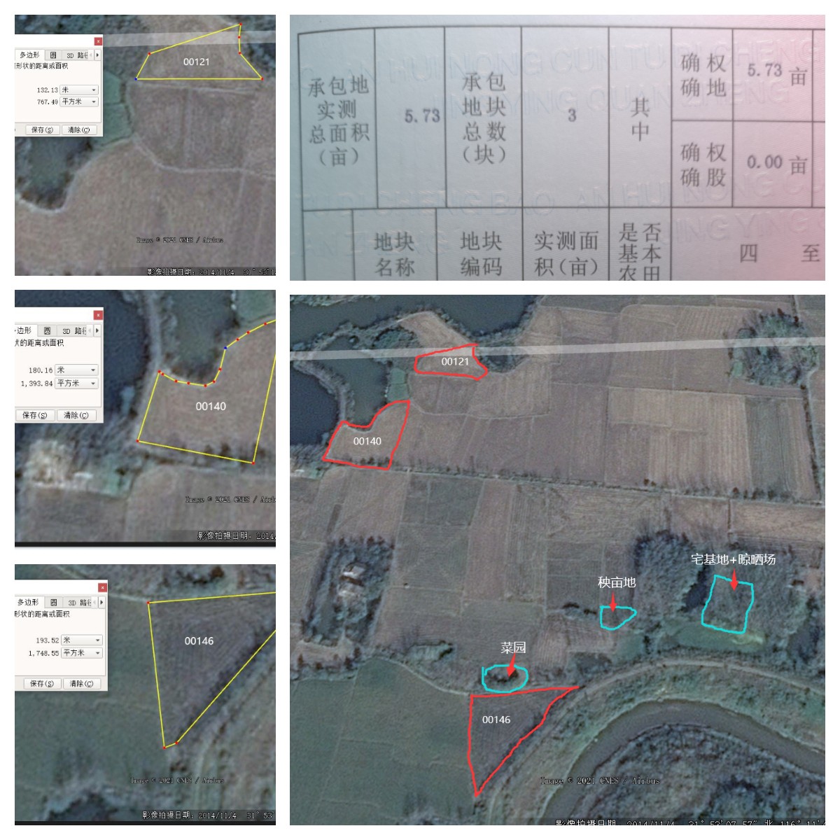 首先感谢叶集区政府关于上个月宅基地问题的及时答复,但是其中有一点有疑问见(222)图中框选所示, “原宅基地面积土地增减挂新增耕地 改造成基本农田,新增面积计入土地确权面积”此项回复有疑问 带着这个疑问 我与8月30日前往洪集镇桥集村村委,向村长咨询宅基地及土地问题 1.区政府告知可以申请宅基地建房,村委是否可以按照相关程序帮助办理。 2.我家目前实际耕作面积大约为 7.8亩,土地证上确权面积为5.73亩, 实际并未计入土地确权面积,为何回复“新增面积计入土地确权面积”? 以下是村长的回复 1.宅基地问题 现在政策严格乡村居民点不给建房,新农村居民点没有土地建房, 新政策没出台没有政策不知道怎么办,暂时办不了 2.土地增减挂问题 土地证面积没错 你们家5口人 村里面按人头算一个人1.12亩 一共5.6亩 现在土地证上5.73亩 测量多了点误差 你还讨了0.13亩的大便宜 宅基地等其他用地改造成基本农田的 无法计入土地确权面积 但是还是属于本人可以继续耕种 关于这两个问题我又去洪集镇人民政府咨询了相关工作人员, 以下是回复 1.宅基地和建房的问题按照国家规定就可以办,但是要村里面协商规划, 村委有困难无法办理,镇政府也没办法直接管辖,还是要找村里面协商解决 2.宅基地等土地 被土地增减挂后的面积应当计入土地证面积, 如果现有的实际耕作面积和土地证上面的面积有差距应先找村里面核实 宅基地和建房的问题,村里面有难处无法办理这个我们能理解 但是这个 “原宅基地面积土地增减挂新增耕地 改造成基本农田,新增面积计入土地确权面积” 这个答复我是不能接受 我用手机GPS测绘软件,测量了现在的耕作面积大约为7.8亩左右 并且在网上用卫星测绘软件查询到了2014年11月04日本村土地卫星图 见图1111所示 图1111右下角图中红色框中的三块土地为土地证上所示的三块承包地 用测绘工具计算出三块地总面积约为3900平方米,大约为5.83亩 蓝色框为我自家的宅基地+晒稻场+秧苗地+菜地 大约有2亩左右 但是我可以肯定的是这些面积是没有计入 我家的土地确权面积的 现在这两亩多地虽然是在继续耕种 但是没有登记 没有备案 就是没有身份的“黑土地” 我现在的诉求就是如何将这个没有确权的土地,登记在农村土地承包经营权证上面? 该到哪办理,具体流程是什么?请区政府为我答疑解惑,感谢!