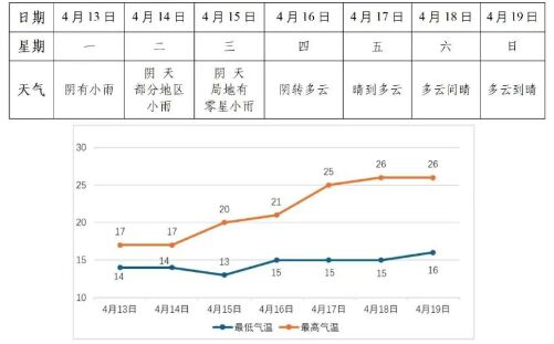 本周前期气温较低,最高气温维持在17℃,期间近地面湿度较大,部分路段能见度较低,出行请注意交通安全;中后期气温逐渐回升,周末最高气温将升至26℃左右,昼夜温差大,请注意适时增减衣物,谨防感冒。具体预报如下: