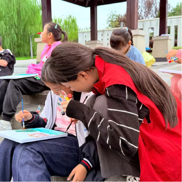 活动在文化馆户外广场展开,小朋友在老师的指导下,手持画板、颜料,认真观察秋日景致——飘落的树叶、静立的建筑、澄澈的蓝天都成了他们笔下的灵感来源。孩子们或坐或立,专注调色勾勒,一幅幅充满童趣和想象力的画作渐渐跃然纸上。老师们穿梭其间,耐心指导构图与色彩运用,鼓励孩子们大胆表达眼中的秋天。