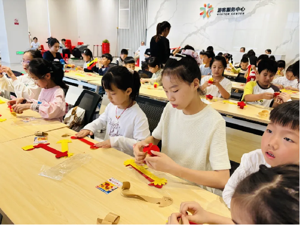 接下来就是期待已久的手工环节,博物馆提前精心筹备了全套手工材料:红色不织布象征着热烈的爱国心,黄色不织布剪裁的五角星、天安门图案充满国庆辨识度,还有印着 “76 周年”“我爱中国” 的装饰贴片,让每个参与者都能轻松创作出专属的国庆纪念物。活动现场,志愿者化身 “手工老师”,耐心指导不同年龄段的参与者:对小朋友,手把手教他们安全使用剪刀、精准粘贴图案;一位小朋友在手环上依次贴上五角星、小国旗和 “妈妈我爱你” 的字样,笑着说:“要把对祖国和妈妈的爱都戴在手上!” 让手环成为独一无二的艺术作品。当大家陆续完成作品,纷纷举起手腕展示时,现场变成了一片红色的海洋 —— 有的手环上 “五角星 + 76” 的组合简洁醒目,有的则缀满了层层叠叠的国庆元素,每一件作品都承载着不同的创意与心意。欢声笑语中,爱国情怀不再是抽象的口号,而是化作了看得见、摸得着、能佩戴的 “纪念信物”,深深扎根在每个人的心中。