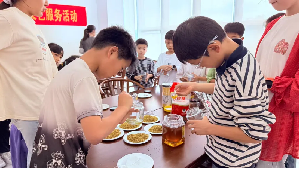 活动伊始,志愿者老师带领小朋友前往文化中心外围开启“寻秋拾花”。金黄的桂花缀满枝头,在老师的指导下轻摘细选,不仅认识了桂花的形态与香气,更在亲近自然的过程中捕捉到秋日的美好,每一片花叶都成为了承载秋味的“自然素材”。随后“秋味酿造”环节充满趣味。志愿者老师详细讲解桂花蜜的制作步骤。孩子们认真清洗桂花、沥干水分,再按照比例将桂花、蜂蜜与糖逐层放入玻璃罐中,罐中层层叠叠的食材,渐渐融合出清甜的香气,也盛满了孩子们对秋天的期待。大家展示着自己制作的桂花蜜,分享制作时的小技巧与心情,接着给玻璃罐贴上专属标签,将这份亲手酿造的“秋味”带回家。