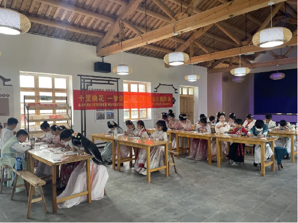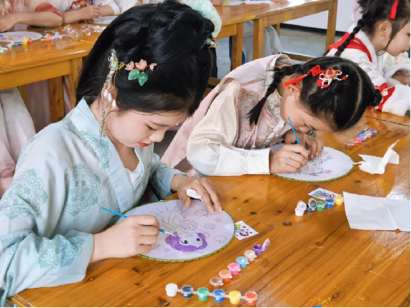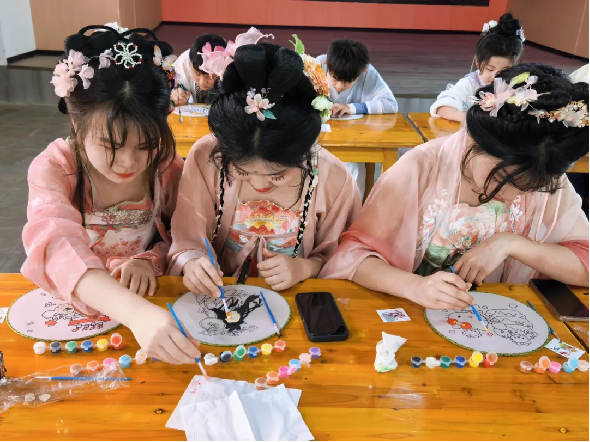 古韵团扇手作环节同样人气爆棚,活动现场精心备齐素面团扇、环保颜料、细画笔等全套手作材料,供参与者随心发挥创意,一笔一画勾勒出稚嫩可爱的桃花、嫩芽,尽显童真童趣;参与者们结合古风元素,精心设计构图,或在扇面上勾勒桃花倩影、绘制山水春景,或题写“桃之夭夭,灼灼其华”等雅致诗词,亲手打造独一无二的专属团扇。大家相互交流创作技巧、分享灵感,现场欢声笑语不断,成品既可以作为游园纪念,搭配汉服拍照又能彰显温婉国风气质,让参与者在指尖创作中,沉浸式感受传统手作的魅力与东方美学的韵味。