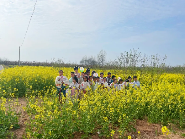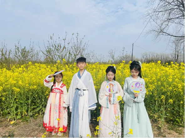 本次游园会兼顾国风体验与亲子休闲,特意联动平岗•欢乐岭上儿童乐园林下花海,打造了一条兼具自然之美与休闲乐趣的游览路线,身着汉服的青少年儿童,沿着花间步道缓缓漫步,大片金黄的油菜花随风起伏,香气沁人心脾,孩子们在花田边驻足观赏、追逐嬉戏,近距离感受田园春日的清新惬意;志愿者老师们则在一旁陪伴,不时为孩子整理汉服、拍照留念,既实现了国风文化的沉浸式体验,又真正做到了“赏国风、享休闲”的双重满足。