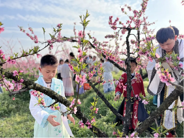 春日最盛,莫过于桃林缀枝。在富岗村桃园广场,漫山遍野的粉色桃花竞相绽放,层层叠叠、缀满枝头,与身着各式汉服的参与者相映成趣,完美诠释了“人面桃花相映红”的诗意场景。活动现场精心设置了趣味书签悬挂环节更添春日暖意。参与者们将手写的春日感悟、美好祝福,一笔一画落笔于精美书签之上,随后悬挂于指定区域。小小一枚书签,不仅是本次游园活动的专属纪念,更是心意的传递、诗意的延续,让春日的温暖与美好在彼此之间传递,为这场国风之旅增添了更多温情与意义。