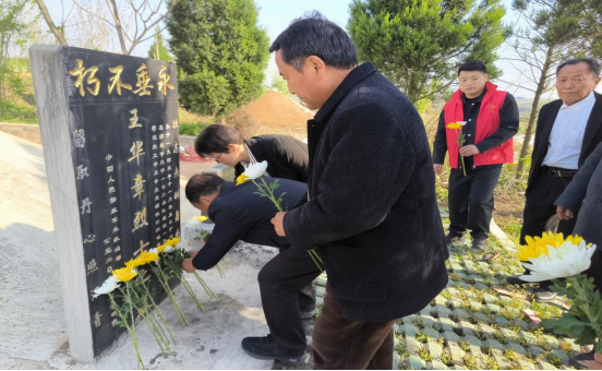 随后,伴随着深情的《献花曲》,志愿者代表缓步走向烈士墓,敬献手中的鲜花。朵朵菊花承载着后辈的崇高敬意,大家依次绕行烈士墓,瞻仰纪念碑,追忆王华章烈士的英勇事迹和革命精神。