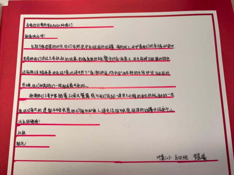 岁末迎新,温情暖军营。为进一步厚植全区青少年的爱国拥军情怀,捎去叶集人民对坚守祖国边海防一线官兵的深情问候与美好祝福。近日,由叶集区退役军人事务局牵头,联合区教育局及叶集二小精心策划并开展“情系边海防”新年送祝福主题活动,组织小学生们用手写贺卡的方式,把浓浓的敬意与新春祝福送往远方的军营。