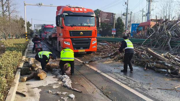 在确认无人员受伤后,执法人员迅速开展货物清理工作,徒手搬运散落树枝,并协调吊车、转运车辆到场,对倾覆货物进行规范转运。两小时后道路恢复畅通,执法人员顶严寒、高效处置,全力保障群众出行安全,生动彰显了交通执法为民、护路保通的责任担当。